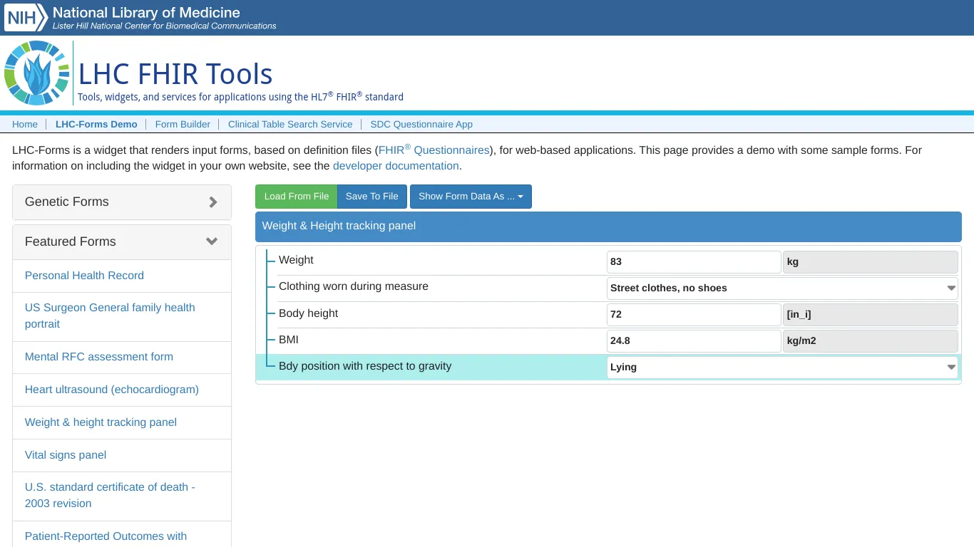 The open source LHC FHIR Tools by the National Library of Medicine (LHNCBC) are a great resource for beginning your FHIR Questionnaire exploration. Here I’m using the LHC-Forms Widget that renders FHIR Questionnaire resources, and looking at the ‘Weight height tracking panel’ sample form provided.